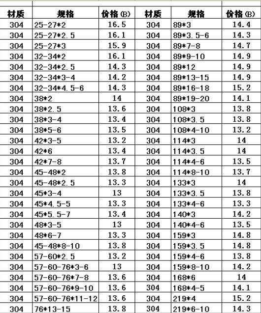 小口徑304不銹鋼無縫管價格表