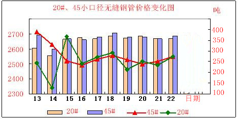 今日聊城無縫鋼管小口徑價格行情,20#、45#材質(zhì),10月13-22號價格變化走勢圖,更直觀的讓采購客戶了解現(xiàn)貨價格及庫存走勢,實時顯示最前沿價格調(diào)整預(yù)測,為您提供最及時有效的價格參考建議。